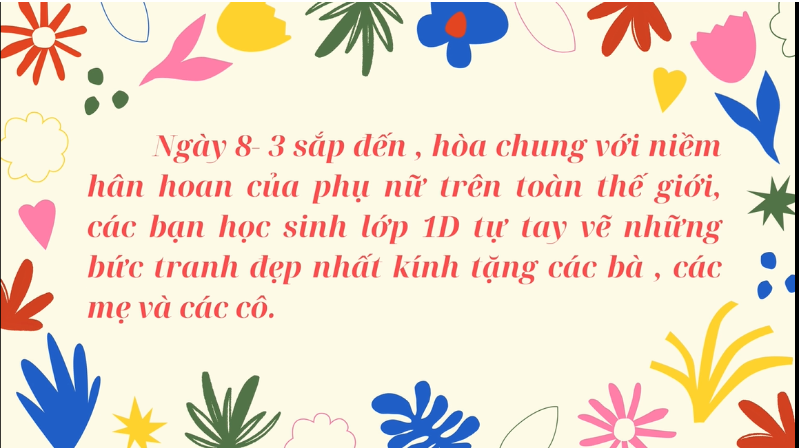 Ngày 8- 3 sắp đến , hòa chung với niềm hân hoan của phụ nữ trên toàn thế giới, các bạn học sinh lớp 1D tự tay vẽ , xé dán những bức tranh đẹp nhất xin kính tặng các bà , các mẹ và các cô.