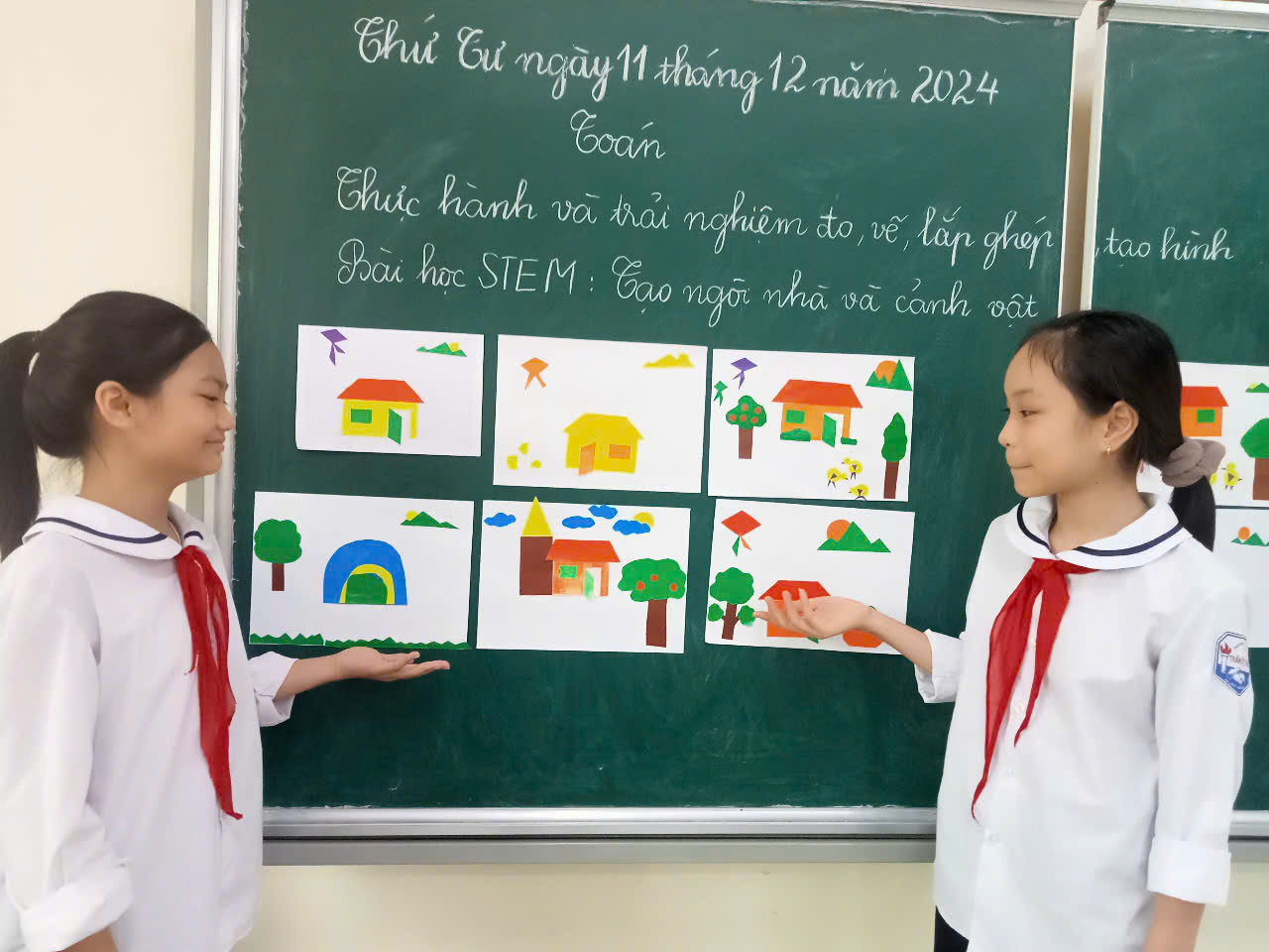 Trong chương trình môn Toán lớp 5, nhiều nội dung có thể ứng dụng giáo dục Stem để tăng cường trải nghiệm cho học sinh, góp phần phát triển năng lực, phẩm chất của người học theo định hướng của Chương trình giáo dục phổ thông 2018.Bài học Stem: "Tạo ngôi nhà và cảnh vật" với kiến thức hình học phẳng . Qua bài học, các em không chỉ đạt yêu cầu về năng lực đặc thù của môn học, được tích hợp liên môn mà các em còn phát triển năng lực tự tin chia sẻ ý tưởng thiết kế, có cơ hội phát triển năng lực giao tiếp, hợp tác, giải quyết vấn đề, thảo luận nhóm,.... Các phẩm chất trách nhiệm, đoàn kết được bồi dưỡng khi các em tham gia hoạt động nhóm tạo sản phẩm. 🌻 Như vậy việc áp dụng và vận dụng giáo dục Stem đã tăng cường hoạt động trải nghiệm cho học sinh, thực sự đem lại hiệu quả, góp phần phát triển năng lực, phẩm chất người học theo định hướng của Chương trình GDPT 2018. Sau đây là một số hình ảnh của tiết học:
