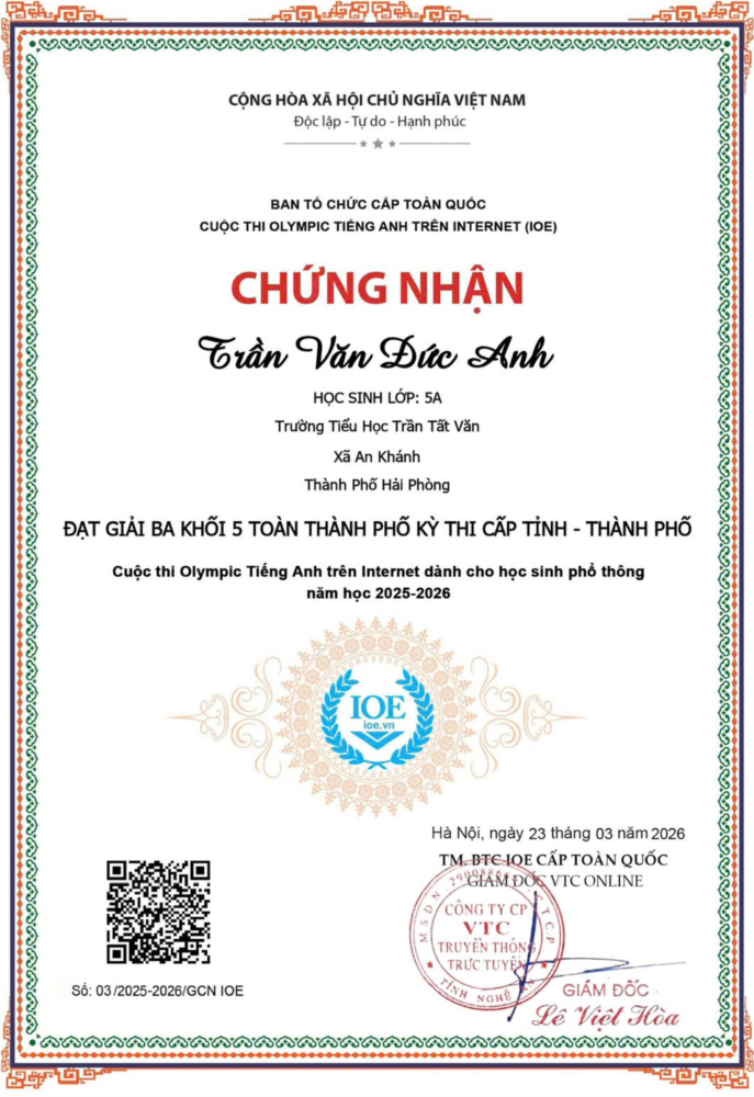 Hôm nay , ngày 24-3-2026, đã có kết quả chính thức cuộc thi Olympic Tiếng Anh trên Internet IOE vòng thi cấp tỉnh - thành phố. Toàn trường có 5 em học sinh đoạt giải. Đó là các em : Trần Phú Quang lớp 4C đạt giải nhì toàn thành phố và giải khuyến khích toàn quốc. Em Trần Văn Đức Anh lớp 5A đạt giải ba toàn thành phố. Em Trần Đỗ Bảo Trân lớp 4B đạt giải khuyến khích toàn thành phố. Em Nguyễn Mai Hương lớp 3B đạt giải khuyến khích toàn thành phố. Em Vũ Đăng Dương lớp 3B đạt giải khuyến khích cấp thành phố. Xin chúc mừng tất cả các em :